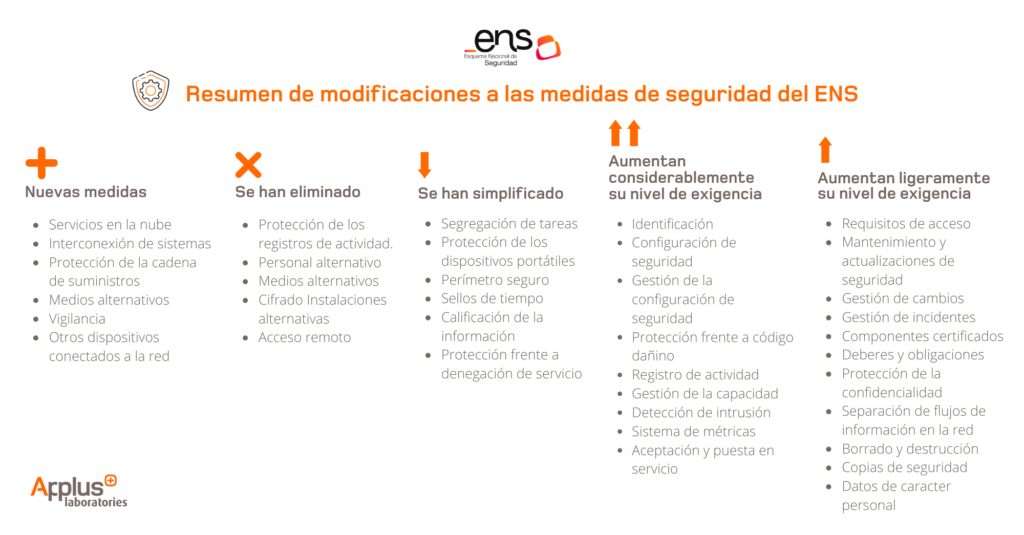 El Esquema Nacional de Seguridad ha modificado las medidas de seguridad: hay medidas nuevas y otras que desaparecen; algunas se han simplificado; mientras que otras han aumentado su nivel de exigencia. La siguiente infografía resume las principales novedades que implica la actualización del ENS.